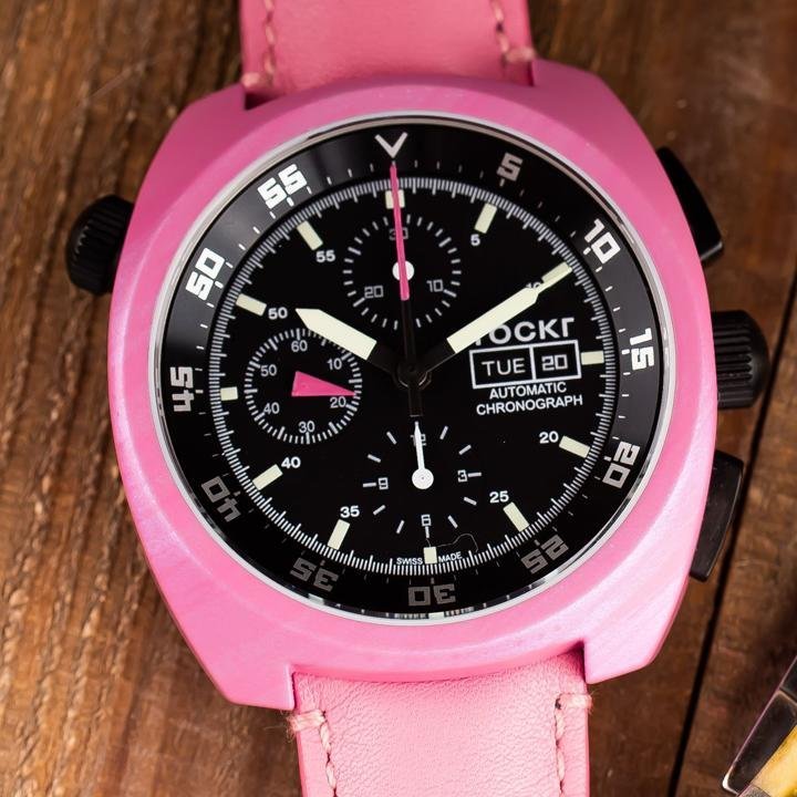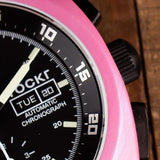 Hydro Dipped Chronograph in Pink, black dial and pink leather strap.