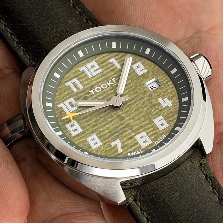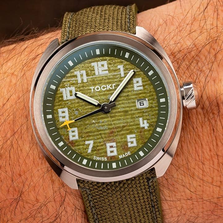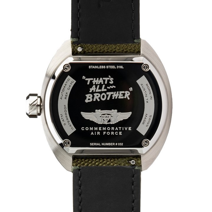 Every D-Day C47 is lovingly assembled in Switzerland. The watch uses a 42mm cushion case, Anti-glare sapphire crystal, and a Swiss Automatic ETA-2824-A6 movement. Each watch comes with two straps: A drab green strap made from canvas webbing, and a more formal brown leather band.